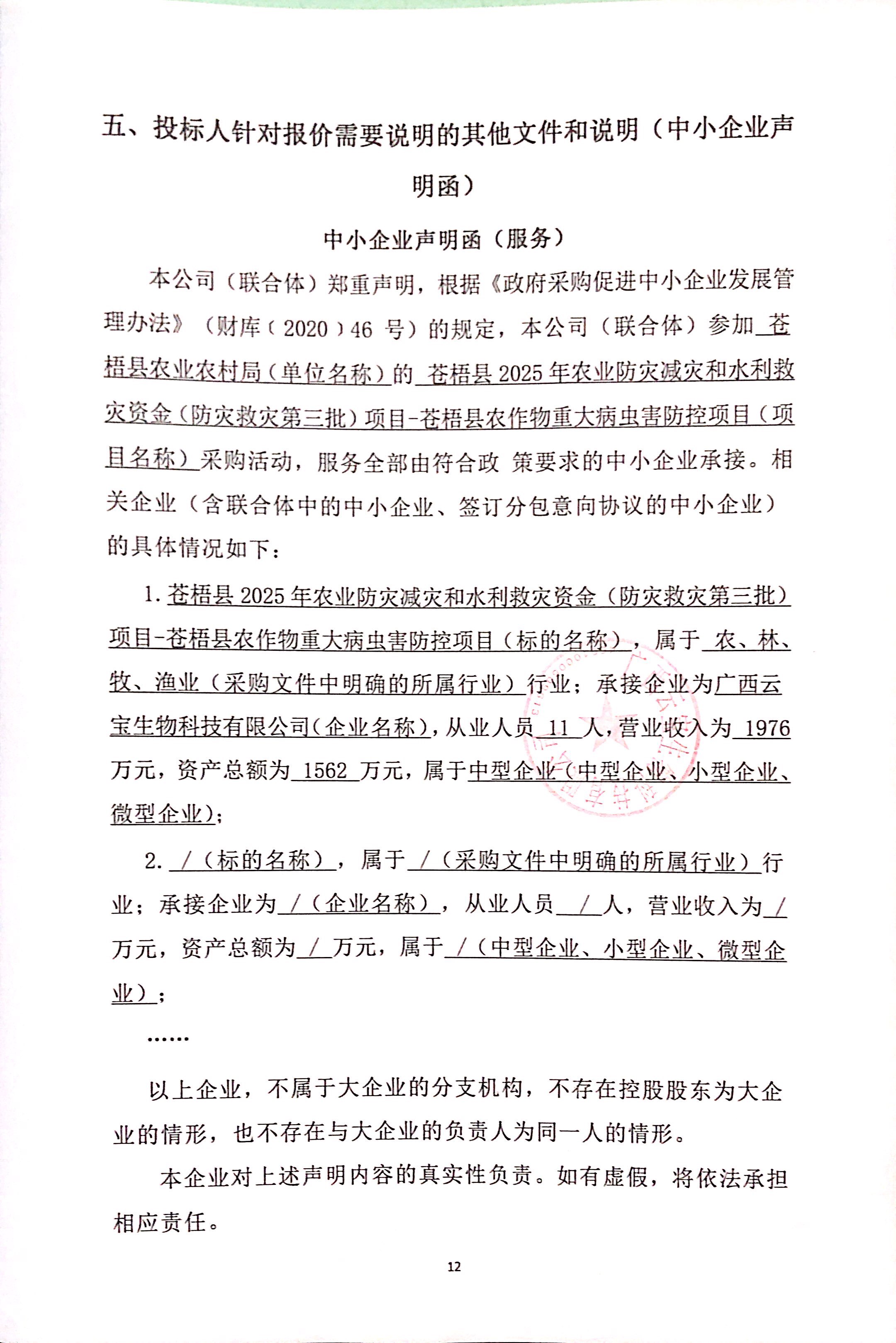 1 | 蒼梧縣2025年農(nóng)業(yè)防災(zāi)減災(zāi)和水利救災(zāi)資金(防災(zāi)救災(zāi)第三批)項目-蒼梧縣農(nóng)作物重大病蟲害防控項目 | 詳見競爭性談判文件和響應(yīng)文件內(nèi)容。 | 合同簽訂后 5 個工作日內(nèi)供貨,并在 20 個工作日內(nèi)完成項目內(nèi)容 | 1.國家強制性標準及有關(guān)規(guī)定。 2.競爭性談判采購文件的采購需求及成交供應(yīng)商響應(yīng)文件響應(yīng)的事項。 3.為確保貨物質(zhì)量避免假冒偽劣產(chǎn)品,供應(yīng)商必須在供貨時提供生產(chǎn)廠家針對此項目的售后服務(wù)保證函原件、供貨證明原件并加蓋生產(chǎn)廠家公章。 4.按以上列明需要提供證書、截圖、文件等資料一并提交我方后才可確認驗收,不提供或提交不全的不予確認。 |
